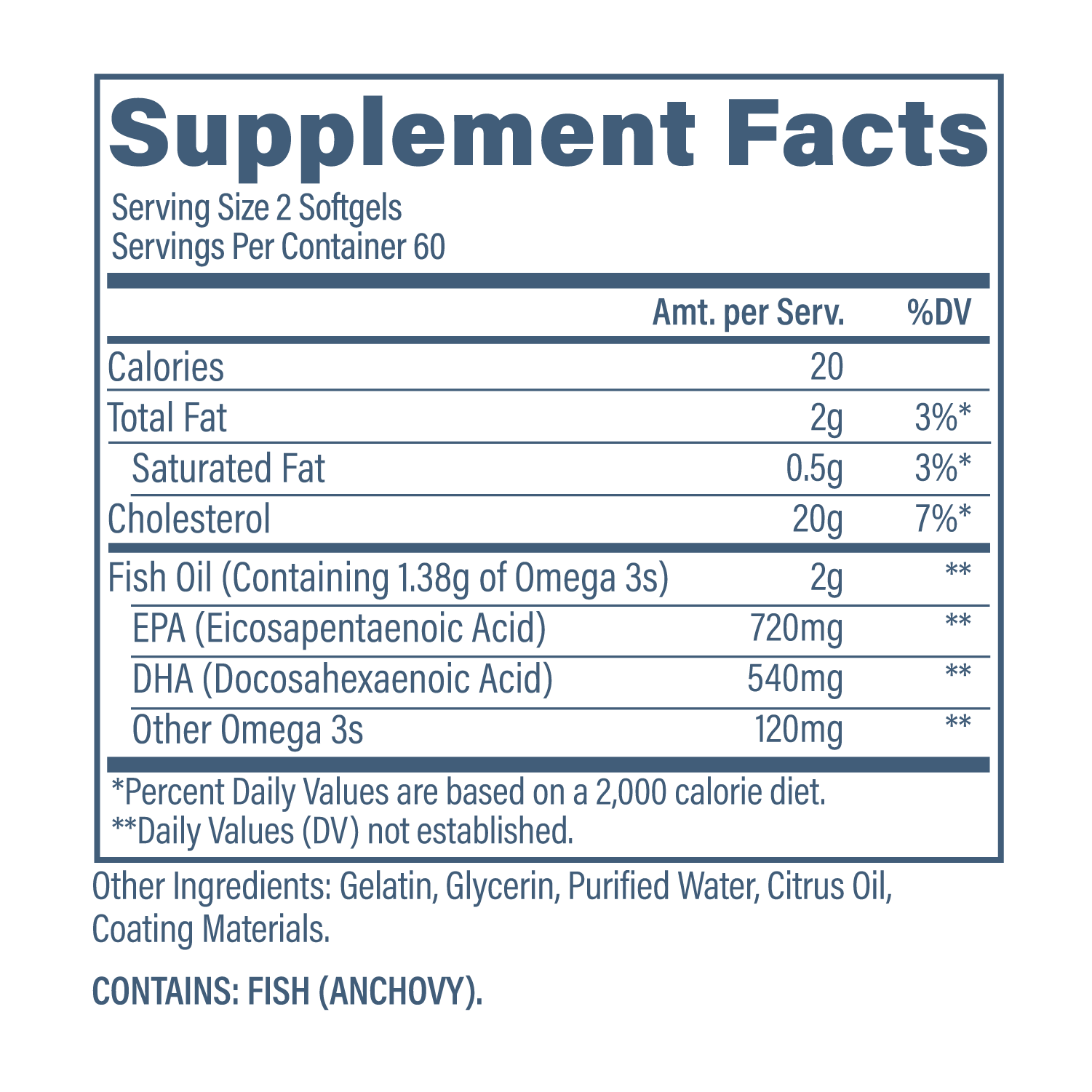 Nuestro OMEGA 3 se obtiene de aceite de pescado de la más alta calidad y ha sido probado por terceros para garantizar su pureza y potencia. Cada cápsula blanda es fácil de tragar y no tiene regusto a pescado, lo que lo hace ideal para todos.